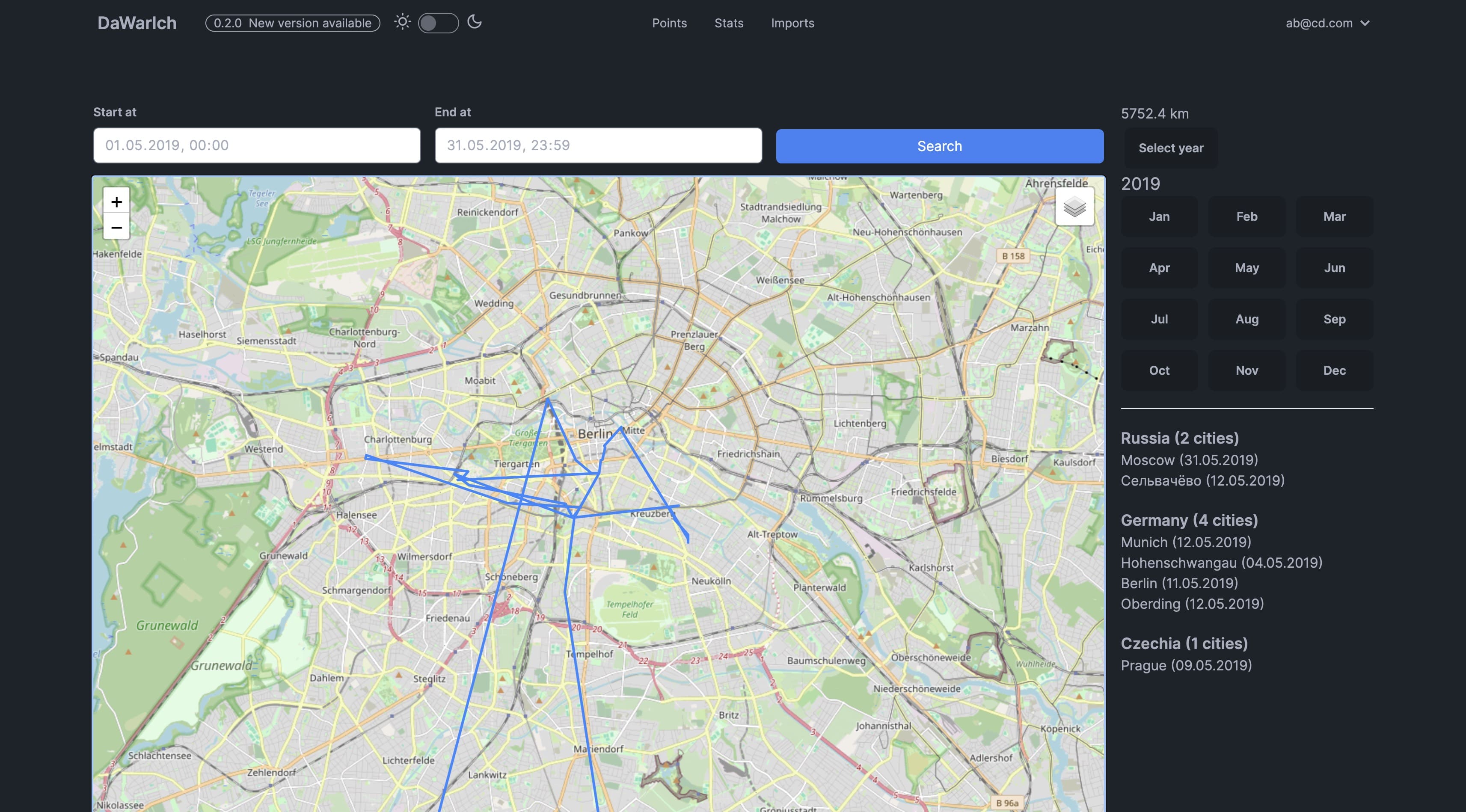 You can see the number of countries and cities visited, the distance traveled, and the time spent in each country, splitted by years and months.