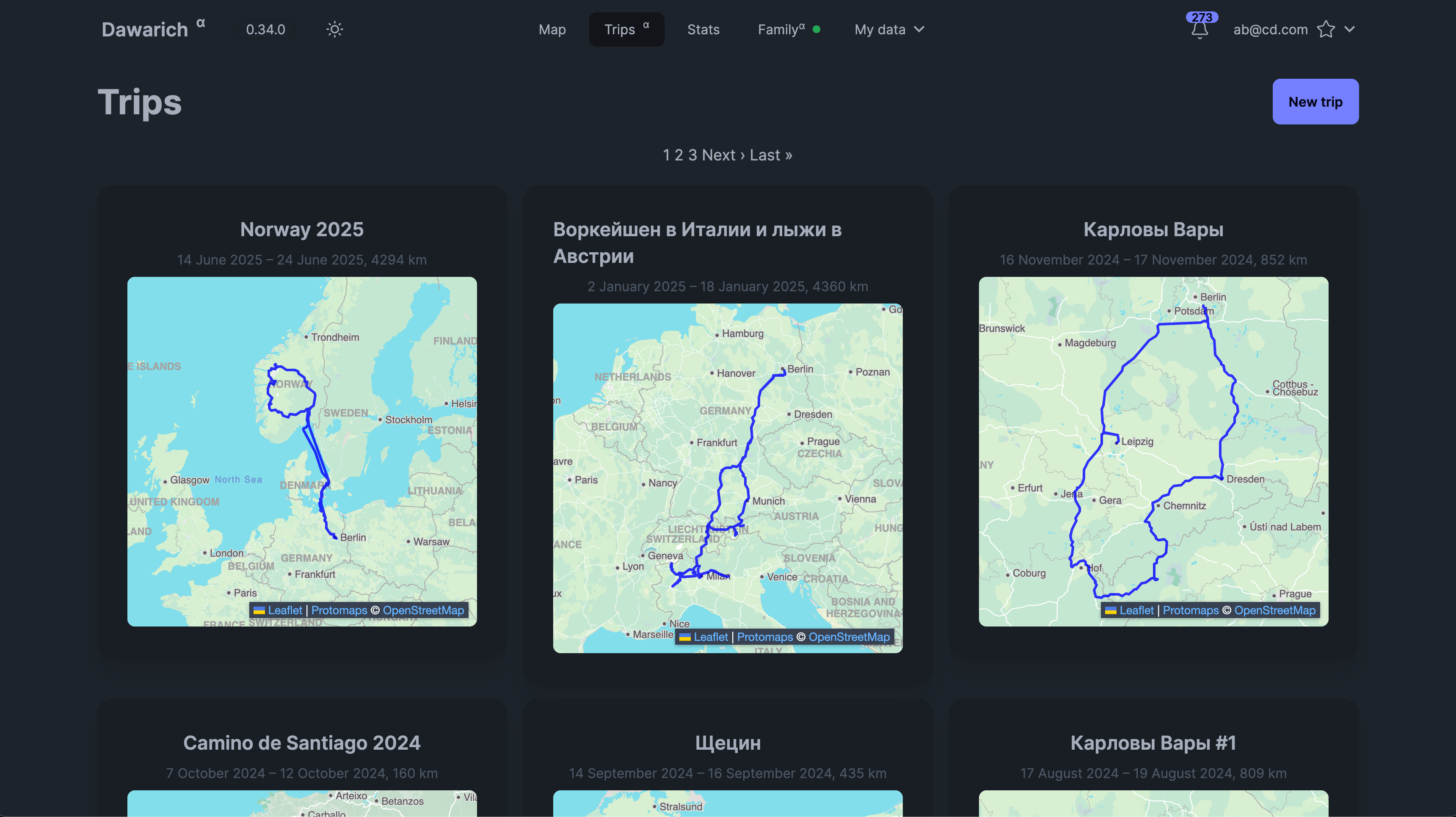 • Create a trip to visualize your travels between two points in time. You'll be able to see the route, distance, and time spent, and also add notes to your trip. If you have Immich or Photoprism integration, you'll also be able to see photos from your trips!