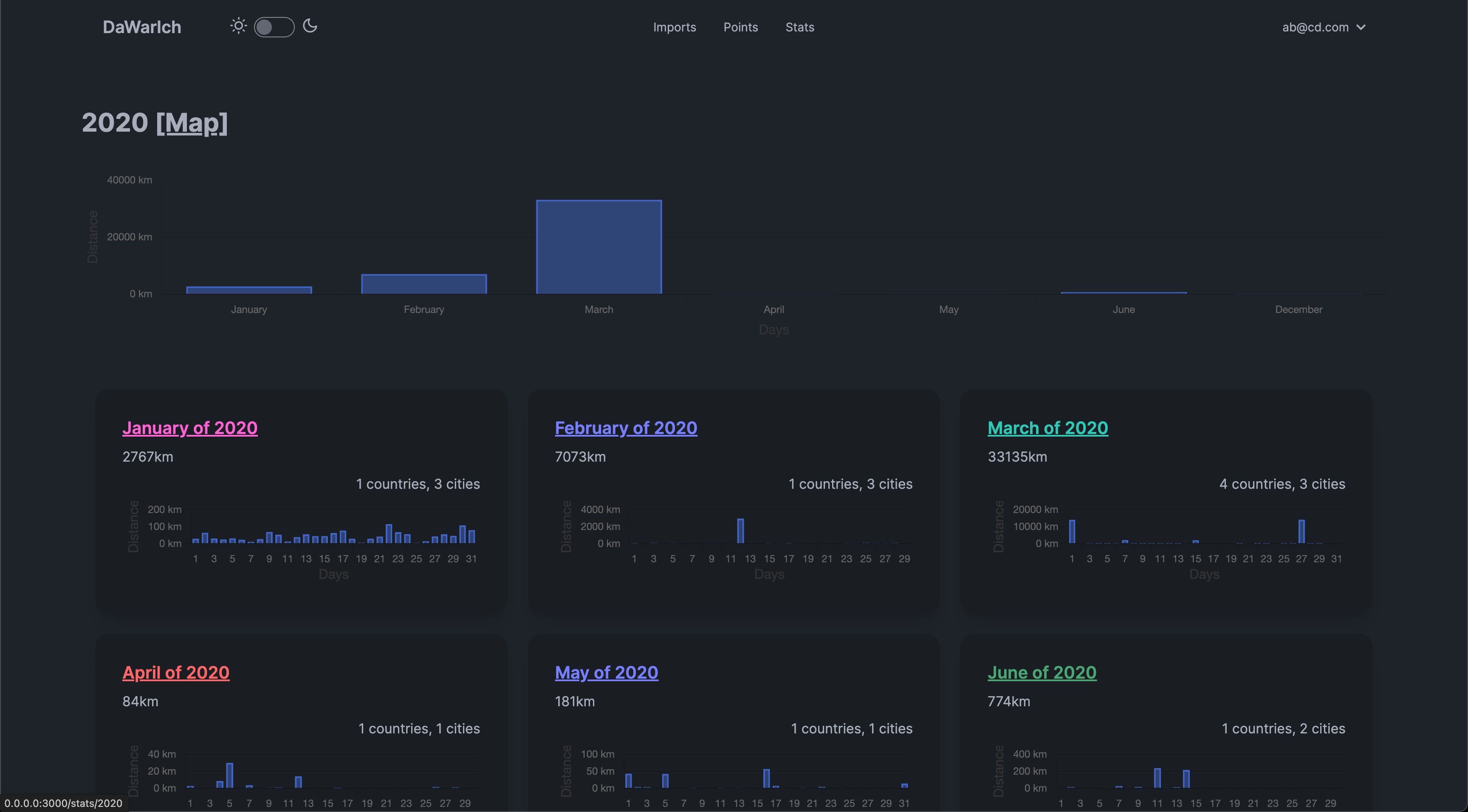 You can see the number of countries and cities visited, the distance traveled, and the time spent in each country, splitted by years and months.